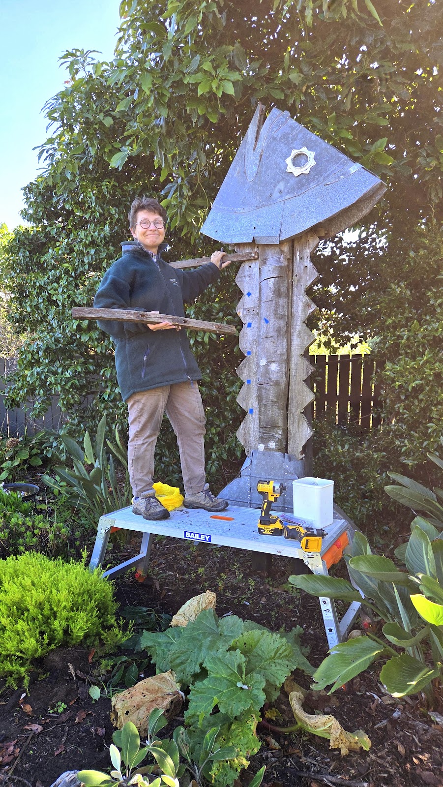 It was looking a bit shabby after a couple of years. So, fresh coat of paint, new wording and artwork, new dog on top, with a stick holder added for stick selection, and she's back in place.